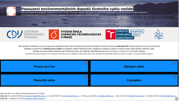 Webová aplikace vytvořená v Power BI pro posouzení enviromentálních dopadů životního cyklu vozidel pro městský provoz. Tato databáze byla vytvořena v Power-BI a obsahuje 3 uživatelské režimy v pořadí od nejjednoduššího po nejsložitější.