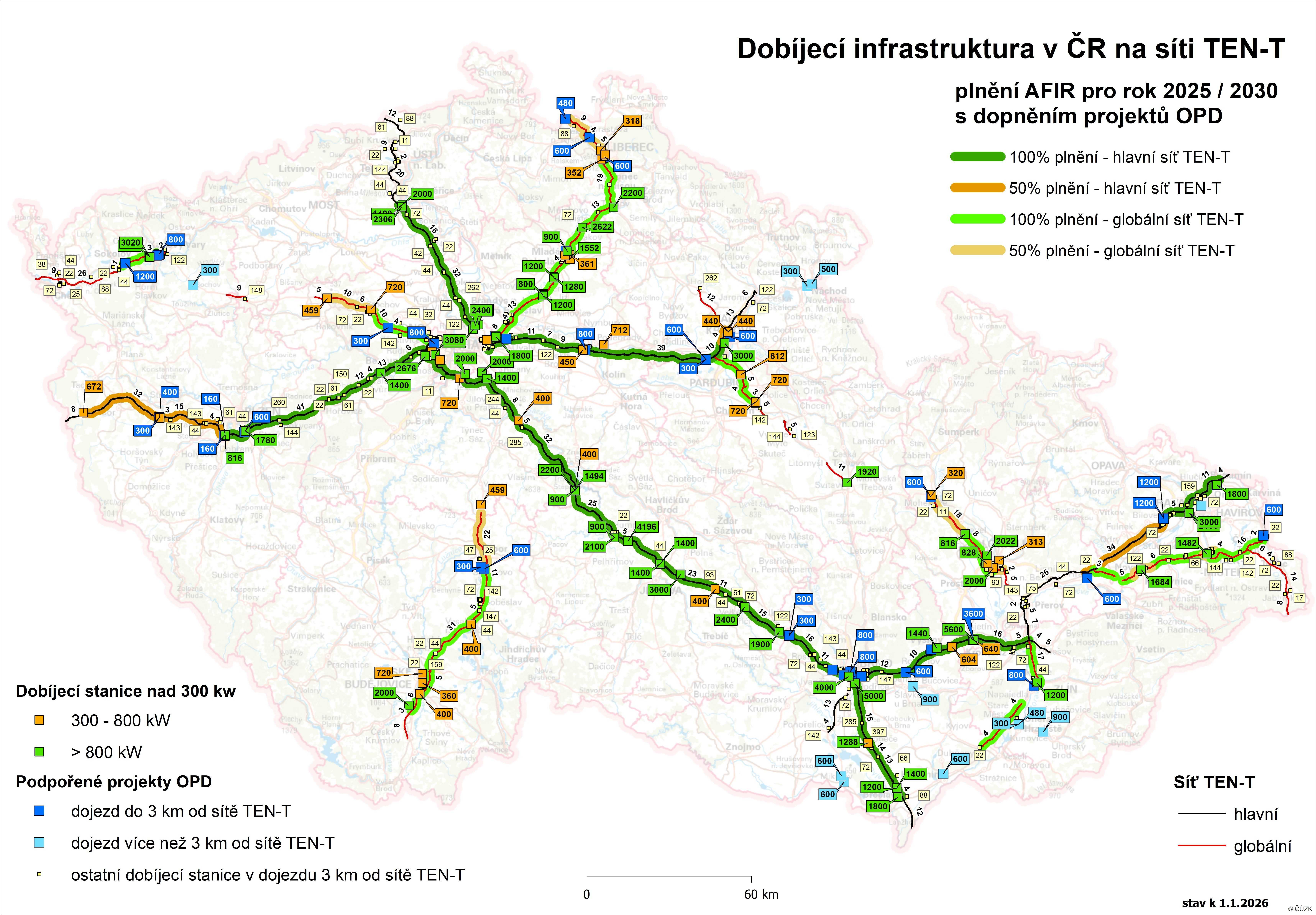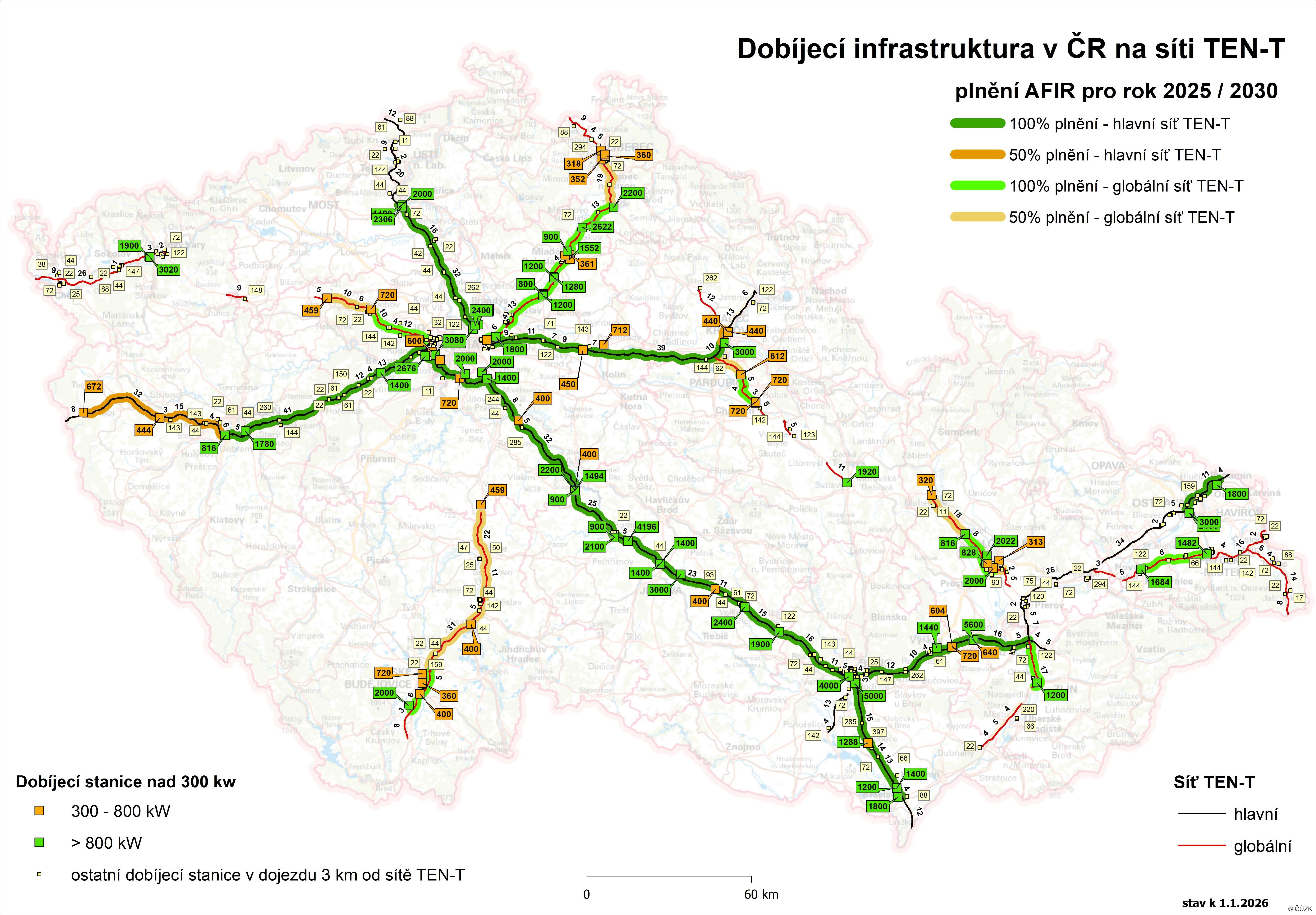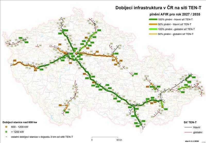 Centrum dopravního výzkumu, v. v. i. v návaznosti na aplikaci Optimalizace veřejné dobíjecí infrastruktury v ČR pravidelně aktualizuje mapu Dobíjecí infrastruktury v ČR na síti TEN-T, která názorně ukazuje, které úseky splňují či nesplňují požadavky Nařízení o zavádění infrastruktury pro alternativní paliva (AFIR).