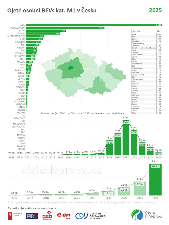 Zájem o ojeté elektromobily v Česku v posledních letech výrazně roste. Podle analýzy Centra dopravního výzkumu (CDV), vycházející z aktualizovaných dat portálu cistadoprava.cz založených na zdrojových údajích Ministerstva dopravy, bylo v roce 2025 do České republiky dovezeno 8,5 tisíce ojetých osobních bateriových elektromobilů, což představuje více než dvojnásobný meziroční nárůst. Celkem je tak v Česku provozováno již 17,5 tisíce dovezených ojetých elektromobilů.
