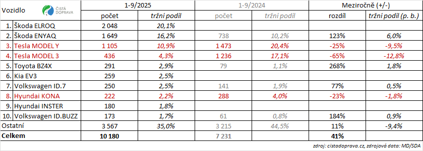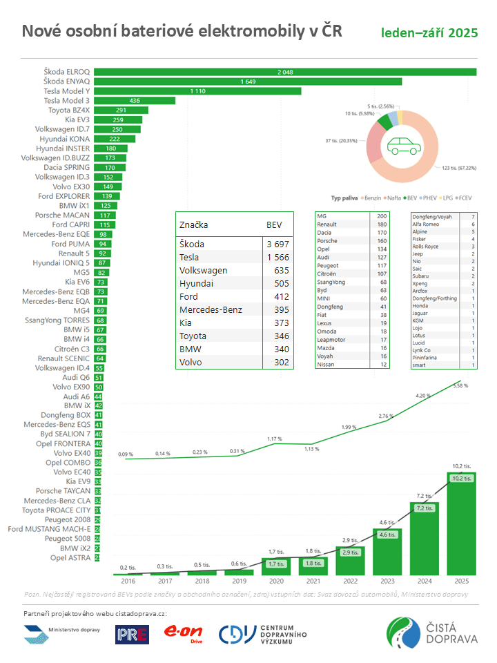 Mezi nově registrovanými elektromobily letos vede Škoda Elroq s 2 048 vozidly. Hned za ní se drží další český zástupce – Škoda Enyaq (1 649 registrací). Bronzovou příčku obsadila Tesla Model Y, které na české silnice přibylo 1 105 vozidel. U některých oblíbených modelů byl letos znatelný pokles – například Tesla Model Y ztratila 25 %, Model 3 dokonce 65 % a Hyundai Kona 23 %. Naopak mezi první desítku nejžádanějších bateriových elektromobilů se probojovaly novinky Škoda Elroq, Kia EV3 a Hyundai Inster.