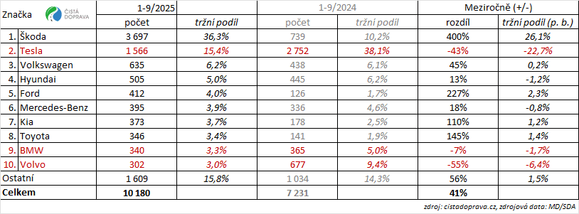 Nejvýraznější meziroční nárůst registrací v segmentu bateriových elektromobilů zaznamenala značka Škoda, která tím získala tržní podíl 36,3 % a pozici lídra trhu v daném segmentu. Tesla, která byla v loňském roce na prvním místě, naopak vykázala meziroční pokles o 43 %, což vedlo ke snížení jejího tržního podílu z 38,1 % na 15,4 %. Růst zaznamenal také třetí Volkswagen, který dosáhl podíl 6,2 %. Mezi další značky z první desítky, které zaznamenaly meziroční pokles registrací, patří BMW, jehož registrace klesly o 7 %, u Volva pak dokonce o 55 %.