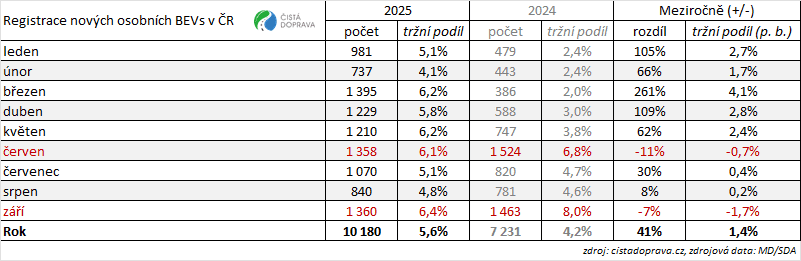 V září 2025 bylo v České republice registrováno 1 360 nových osobních bateriových elektromobilů (BEV), což představuje meziroční pokles o 7 % oproti září 2024. Tržní podíl BEV v tomto měsíci dosáhl 6,4 %, což je o 1,7procentního bodu méně než ve stejném období loňského roku. Za prvních devět měsíců roku 2025 tak bylo celkem registrováno 10 180 nových BEV, což představuje meziroční růst o 41 % a zvýšení jejich celkového tržního podílu na 5,6 % (oproti 4,2 % v roce 2024). Výrazný meziroční nárůst byl zaznamenán zejména v březnu (+261 %) a dubnu (+109 %), zatímco v červnu a v září došlo k poklesu registrací.