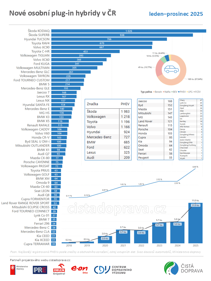 V průběhu roku 2025 bylo nově zaregistrováno 11 033 plug-in hybridních vozidel, což odpovídá meziročnímu nárůstu o 87 %. Tržní podíl tohoto segmentu tak dosáhl 4,4 %, zatímco v roce 2024 činil 2,6 %. Nejčastěji registrovaným modelem roku se stala Škoda Kodiaq (1 026 vozidel), následovaná modely Škoda Superb (938) a Hyundai Tucson (766).