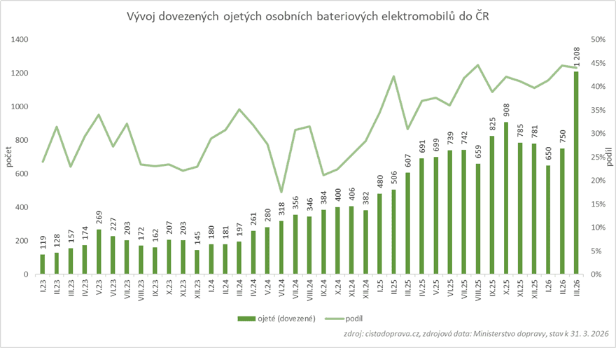 K 31. březnu 2026 bylo v Česku registrováno více než 63 tisíc osobních bateriových elektromobilů, přičemž dovezená ojetá vozidla tvoří téměř třetinu (31,7 %). Význam dovozu dále roste – letos se ojeté elektromobily podílely na celkových registracích elektromobilů z 43,4 procenta, zatímco loni to ve stejném období bylo 35 procent a před dvěma lety 31,5 procenta.