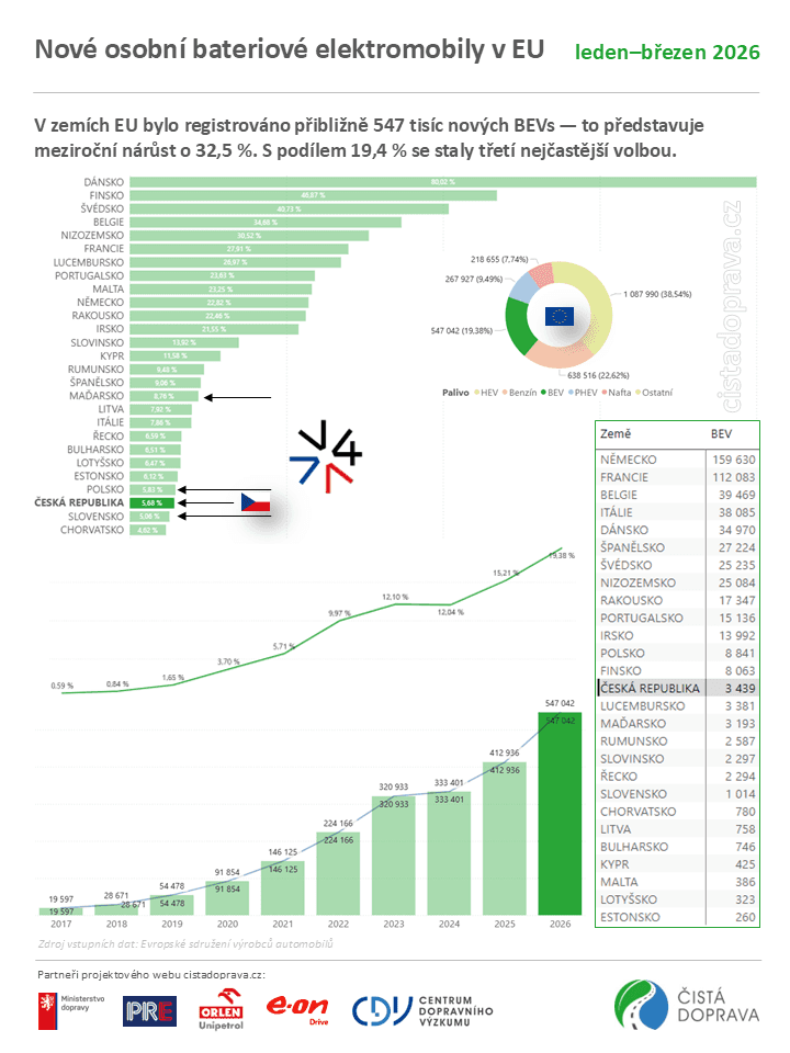 Trh s novými osobními bateriovými elektromobily v Evropské unii v prvním čtvrtletí roku 2026 rostl – jejich registrace se meziročně zvýšily o 32,5 % na 547 tisíc vozidel. Také Česká republika zaznamenala meziroční nárůst (o 10,5 %), podíl elektromobilů na nových registracích však zůstává výrazně pod evropským průměrem. Zatímco v EU dosáhl tržní podíl bateriových elektromobilů 19,4 % (15,2 % v 1–3/2025), v České republice činil 5,7 % (5,2 % v 1 –3/2025). Údaje vycházejí z aktualizovaných dat webu cistadoprava.cz, založených na statistikách Evropského sdružení výrobců automobilů a dalších relevantních zdrojích.