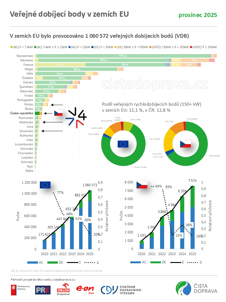 V Česku je provozováno 7 574 veřejných dobíjecích bodů, během uplynulého roku se jejich počet zvýšil o 19 % (+ 1 215 bodů). Téměř tisíc z nich (967) je vysoce výkonných 150+ kW. V zemích Evropské unie je provozováno více než 1,06 milionu veřejných dobíjecích bodů, vyplývá z aktualizovaných informací webu cistadoprava.cz, které vycházejí ze zdrojových dat Evropské observatoře pro alternativní paliva.